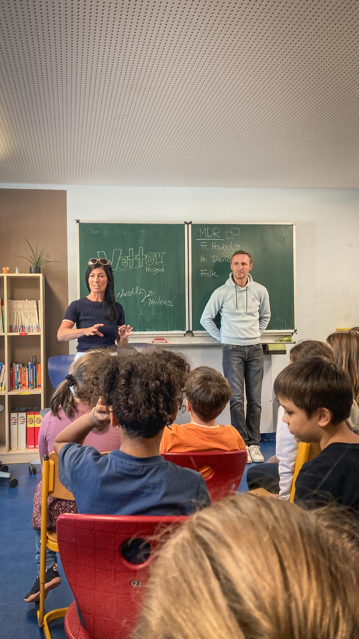 Die Stammgruppen "Planeten" und "Sterne" haben sich in den vergangenen Wochen mit dem Thema "Wetter" beschäftigt. Dabei ging es neben dem Kennenlernen von verschiedenen Wetterphänomenen, dem Wasserkreislauf und kleinen Experimenten auch um Wetterberichte. Um einmal live zu sehen, wie Wetternachrichten gemacht werden, hatten wir das MDR Wettermobil zu Gast und waren teil der Wetternachrichten im Thüringen Journal. Natürlich konnten die Kinder eine Menge Fragen stellen, Einblicke bekommen und durften auch die Technik kennenlernen. Die Sendung vom 24.09. kann in der Mediathek noch angeschaut werden.